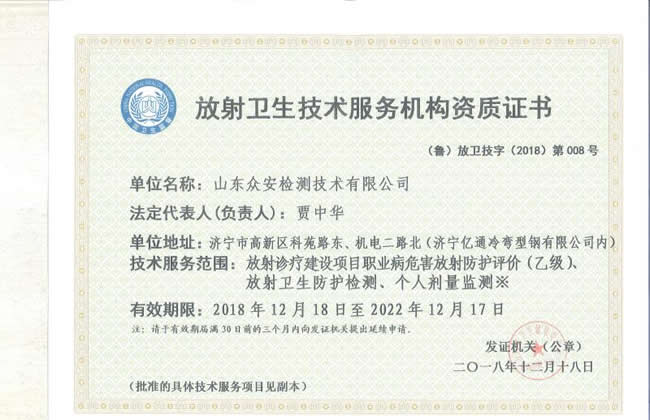 2018年12月18日,山东众安检测技术有限公司取得了山东省卫生健康委员会为换发的新《放射卫生技术服务机构资质证书》。